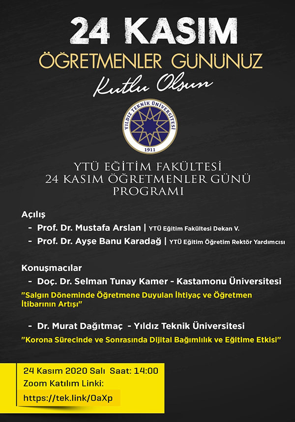 Eğitim Fakültesi ev sahipliğinde 24 Kasım 2020 Salı günü saat 14:00’de Zoom üzerinden (https://tek.link/OaXp) düzenlenecek “Öğretmenler Günü Kutlama Programı“na katılımınız bizleri onurlandıracaktır.
