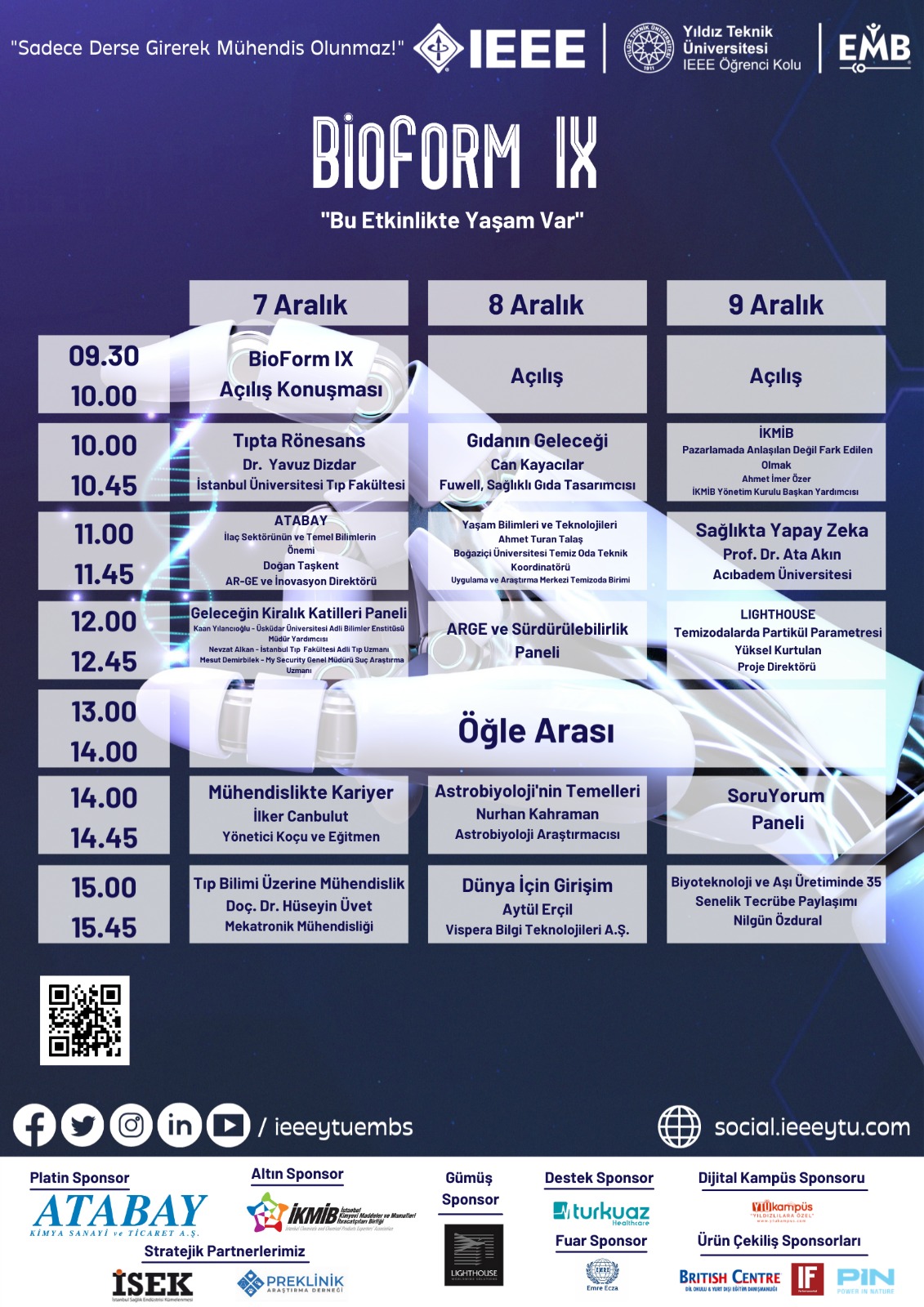 IEEE YTÜ EMB Komitesi bünyesinde “Bu Etkinlikte Yaşam Var!” mottosuyla bu yıl dokuzuncusunu düzenleyeceğimiz Bioform IX etkinliğimizin kayıtları başladı! Tıpta mühendislik uygulamaları, kimya, ilaç, genetik, medikal, biyoteknoloji konularında, alanında uzman kişileri ağırlayacağımız etkinliğimiz 7-8-9 Aralık’ta Tarihi Hamam’da gerçekleşecek! Sen de sektörü daha iyi tanımak, iş ağını genişletmek istersen bu etkinlikte yerini almayı unutma!