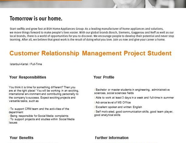 Kaynak ve Daha Fazla İlan: https://www.universitestaj.com/customer-relationship-management-project-student-bsh-ev-aletleri-san-ve-tic-a-s-istanbulasyakartal/