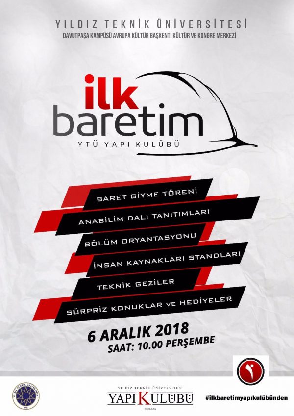 2013 yılında Türkiye’de ilk defa YTÜ Yapı Kulübü tarafından gerçekleştirilen “İlk Baretim” etkinliği her sene olduğu gibi bu sene de öğrencilerle buluşuyor. Bu sene YTÜ öğrencilerinin yanında diğer üniversitelere de kontenjanın açıldığı İLK BARETİM’18 etkinliği 6 Aralık 2018 tarihinde saat 10.00 da Yıldız Teknik Üniversitesi Davutpaşa Kongre ve Kültür Merkezi’nde düzenlenecektir. Etkinliğe diğer üniversitelerden katılmak isteyen arkadaşların aşağıdaki docsu doldurması gerekmektedir.