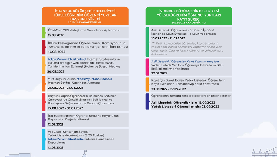 Öğrencilere başvuru için 22 Ağustos’tan itibaren 7 günlük süre tanınıyor. Web sitesinde başvuru ekranı 28 Ağustos gece 23:59’a kadar açık olacak. Değerlendirme sürecinin ardından öğrenciler başvurularının sonuçlarına 12 Eylül 2022 tarihinden itibaren, https://yurt.ibb. istanbul/ web sitesinden ulaşılabilecekler. 15-21 Eylül tarihleri arasında (5 iş günü) asil listede yer alan öğrenciler, 23-29 Eylül (5 iş günü) tarihleri arasında ise yedek listedeki öğrenciler 09.00–19.00 saatleri arasında İBB Yurtlarına kayıt yaptırabilecekler. Belirtilen tarihlerin dışında gelen ya da web sitesinde belirtilen kayıt evraklarını eksik teslim edenlerin kayıtları alınmayacak.