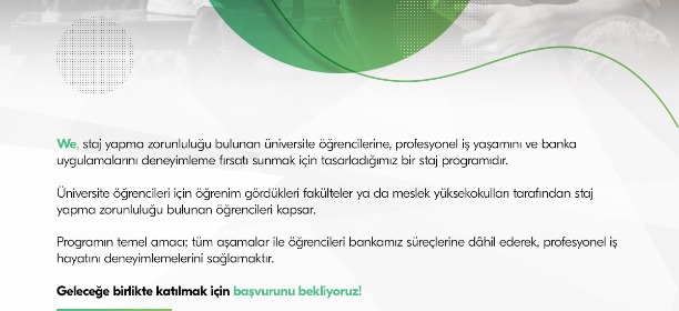 We, Staj yapma zorunluluğu bulunan üniversite öğrencilerine, profesyonel iş yaşamını ve banka uygulamalarını deneyimleme fırsatı sunmak için tasarladığımız bir staj programıdır.