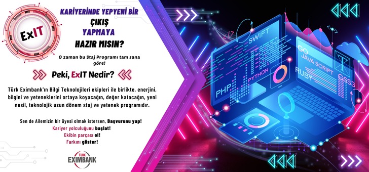 Türk Eximbank olarak, bankamızın Bilgi Teknolojileri ekipleri ile birlikte, enerjini, bilgini ve yeteneklerini ortaya koyacağın, teoride öğrendiklerini pratiğe dönüştürebileceğin, katılacağın projeler ve uygulamalarla değer katacağın, yeni nesil, teknolojik uzun dönem staj ve yetenek programıdır.