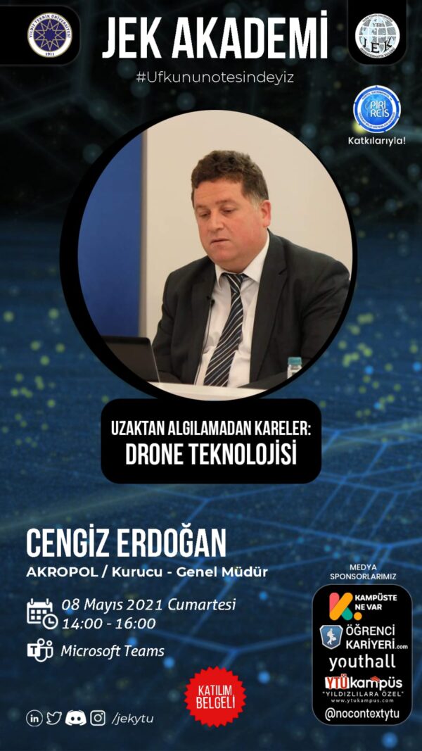 YTÜ Jeoenformatik Kulübü olarak “JEK AKADEMİ” projemizin ” Uzaktan Algılamadan Kareler: DRONE TEKNOLOJİSİ” adı altındaki etkinliğimize konuşmacı olarak Cengiz Erdoğan’ın katılımıyla 8 MAYIS 2021 Cumartesi tarihinde gerçekleşecektir.