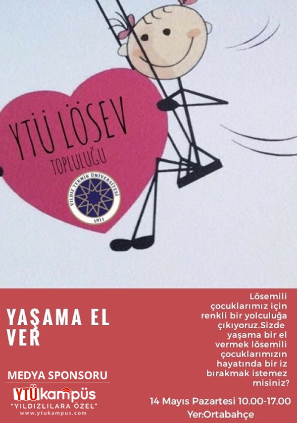 YTÜ Lösev Topluluğu olarak 14 Mayıs Pazartesi günü Yaşama El Ver etkinliği düzenliyoruz.🌸Çocuklarımızın hayatına bırakacağınız değerli bir iz için hepinizi Ortabahçe’ye bekliyoruz!