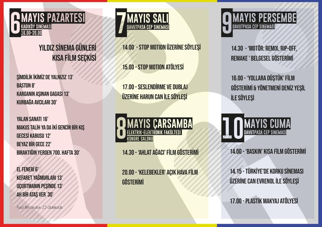 6 Mayıs’ta kısa film seçkisi ve açılış kokteyliyle başlayacak olan festival hafta boyunca yapılacak etkinliklerle devam edecek, 10 Mayıs akşamı yapılacak plastik makyaj atölyesiyle son bulacaktır. Film gösterimleri, söyleşi ve atölyelerle katılımcılara keyifli anlar sunmayı amaçlayan festival herkese açıktır. Etkinlik mekânı YTÜ Davutpaşa Kampüsü ve Kadıköy Sineması’dır.