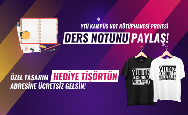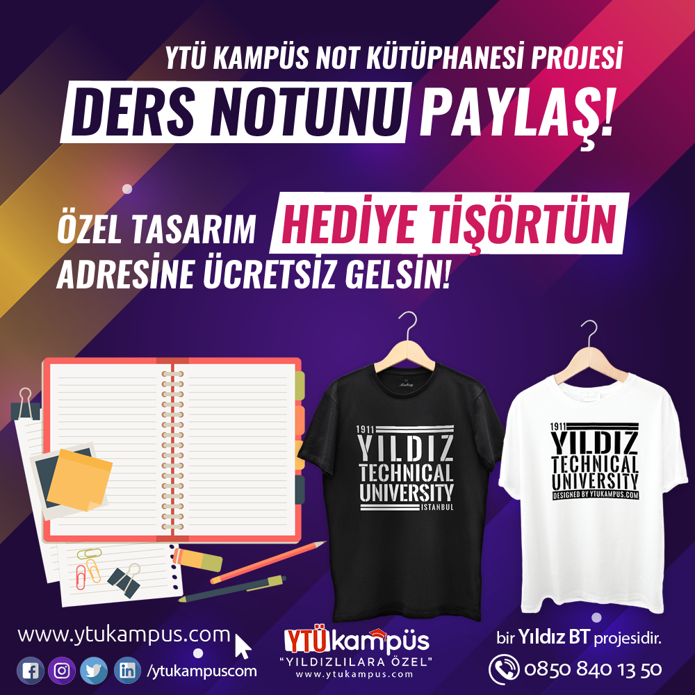 Derslerde tuttuğunuz notları paylaşmaya ne dersiniz? YTÜ Kampüs, kurulduğu günden beri öğrencilerin birbiri ile yardımlaşmasını, bilgi alışverişinde bulunmasını hedeflemiş bir platformdur. Siz de notlarınızı paylaşarak diğer öğrencilerin bu notlardan faydalanmasını sağlayabilir ve çekilişsiz, kurasız özel üniversite tişörtüne sahip olacak.