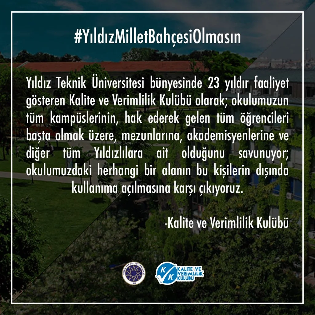 Millet Bahçesi’ne karşı tepki gösteren ilk kulüp Kalite ve Verimlilik Kulübü oldu. Sosyal medya hesaplarından paylaşım yapan YTÜ KVK, “Millet Bahçesi İstemiyoruz” dedi.