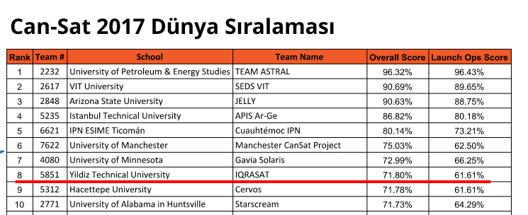 Yıldız Teknik Üniversitesi IQRASAT takımı, ABD’nin Texas eyaletinde yapılan Dünya çapında ünlü model uydu yarışması Can-Sat 2017’de genel sıralamada Dünya 8.’si, tasarım alanında ise Dünya 5.’si oldu!