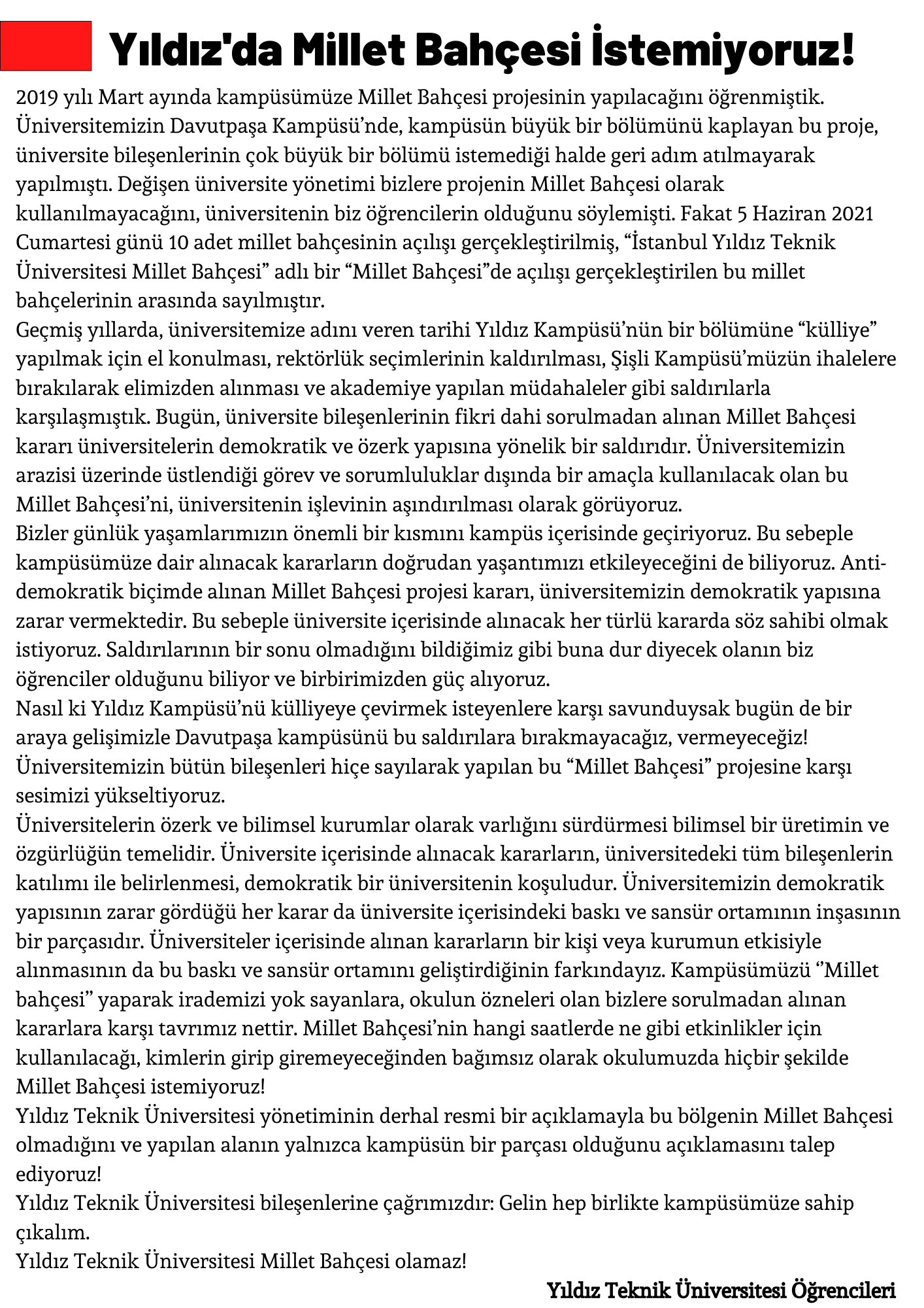 Her şeye siyasi fikrinizi alet etmeseniz keşke . Olayı saptirmaktan başka bir şey yapmıyorsunuz. Millet bahçesinin kimler tarafından kullanılacağını öğrenmek için ve diğer soru işaretlerini gidermek için toplanma amacı vardı. Maalesef bazı arkadaşlar herkesin adına kendi fikirlerini ortaya koyarak olayı çok başka yerlere çekiyor. Siyasi görüşünüz bizi ilgilendirmez bizde bazı olaylardan bazı kişilerden elbette memnun değiliz orası ayrı konu ama bunu konuşmanın yeri de burası değil arkadaşlar . Biz apolitik bir şekilde sadece haklarının bilincinde olan YTÜ öğrencileri olarak orada bulunmaliyiz. Siyasi kimliklerimiz ile değil . Ayrıca umuyorum ki Tamer hoca da bizim gibi düşünüp bu yönde olumlu adımlar aticaktir.