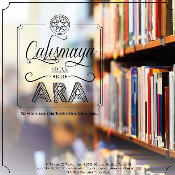 Değerli öğrencilerimizin vize sınavlarına destek sağlamak amacıyla, Rektörlüğümüzün himayelerinde, Sağlık, Kültür ve Spor Daire Başkanlığımızın koordinatörlüğünde, Free Turizm sponsorluğunda Davutpaşa Kampüsü Şehit Prof. Dr. İlhan VARANK Merkez Kütüphanesi’nin yanında bulunan kafede, Yıldız Kampüsü’nde Tonoz Kafe’de (14 Kasım 2017 akşamından, 17 Kasım 2017 gecesine kadar) ücretsiz olarak sabah 07.00-11.00 saatleri arasında çay ve poğaça, akşam 19.00-24.00 saatleri arasında çorba ikramı yapılacaktır.