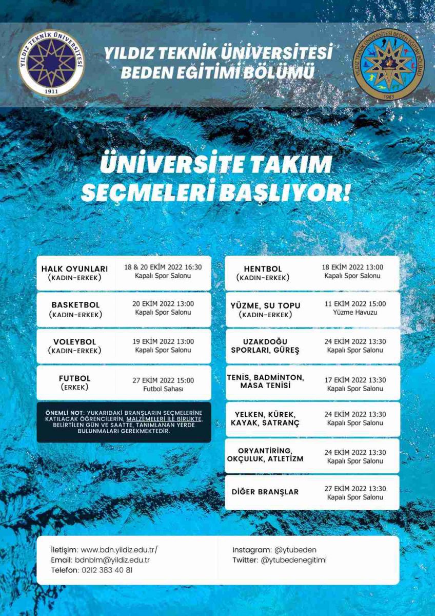 Yıldız Teknik Üniversitesi bünyesinde bulunan üniversite takımlarında yer almak için belirtilen gün ve saatlerde seçmenin yapılacağı yere ilgili sporcuyu bekliyoruz!