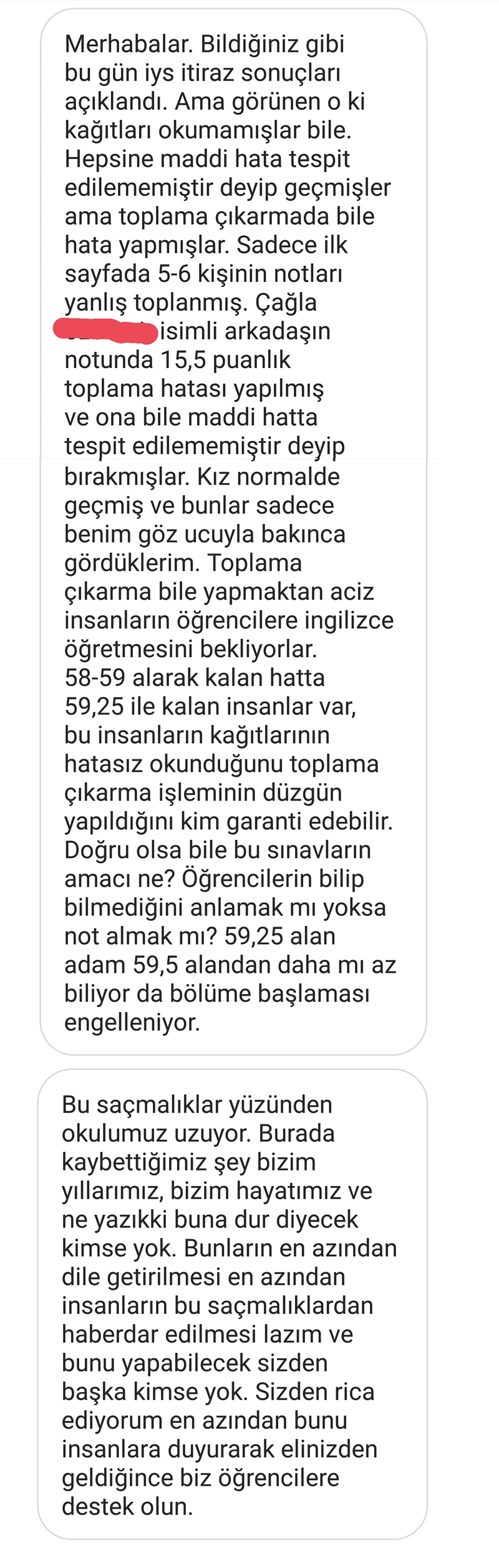 Bunun haricinde 21-22 Ağustos İYS’sine girip adının herhangi bir sınıfta olmadığını söyleyen öğrenciler var. Diğer bir konu ise YBD bazı zamanlarda 58 ve 59 notlarını 60 yazıp geçiriyor bazen geçirmiyor. Writing bölümünün olduğu bu sınavlarda bir hocanın Writing notunu farklı diğer hocanın farklı okuması çok muhtemeldir. 59.25 puanla öğrenci bırakılması hata payını da sayarsak doğru olmaması gerekir. Bu yanlışlıkların güvenilir doğrularla değiştirilmesi için tüm İYS sonuçlarının tekrar okutulmasını talep ediyoruz.