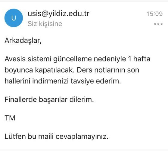 Bazı hocalar kendi öğrencilerine AVESİS’in 1 hafta boyunca kapalı kalacağını ve mevcut ders notlarını şimdiden indirmeleri gerektiğini mail yoluyla iletti. Mail almış öğrenciler indirmiş olsa da bu bakım/güncellemeden haberi olmayan binlerce öğrenci var. Binlerce öğrenci şuanda ders notlarına, bilgilendirmelere, final haftası teslim edilecek zorunlu ödev detaylarına ulaşamıyor.