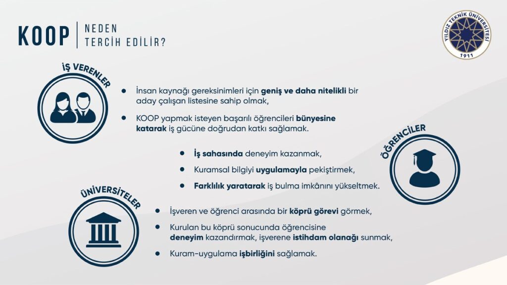 Yıldız Teknik Üniversitesi, çeşitli sosyal medya hesaplarından KOOP Eğitim Modeline geçeceğini duyurdu. Yurtdışında oldukça popüler olan ve ülkemizde çok az sayıda okulda görülen bu eğitim modelinin öncelikli amacı teorik eğitim ile iş dünyasını birleştirmek üzerine kuruludur.