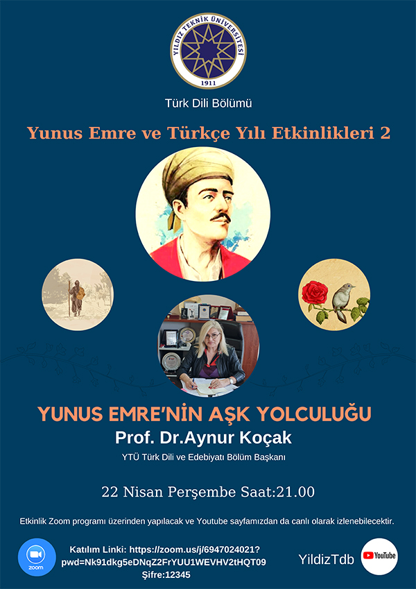 Yunus Emre ve Türkçe Yılı Etkinlikleri kapsamında bölümümüz tarafından “Yunus Emre’nin Aşk Yolculuğu” konulu konferans düzenlenecektir. Yıldız Teknik Üniversitesi Fen Edebiyat Fakültesi Türk Dili ve Edebiyatı Bölüm Başkanı Prof. Dr. Aynur Koçak’ın konuşmacı olarak katılımıyla online olarak gerçekleşecek etkinliğimiz 22 Nisan Perşembe Saat:21.00’de Zoom ve YouTube hesabımız üzerinden canlı olarak yayınlanacaktır.