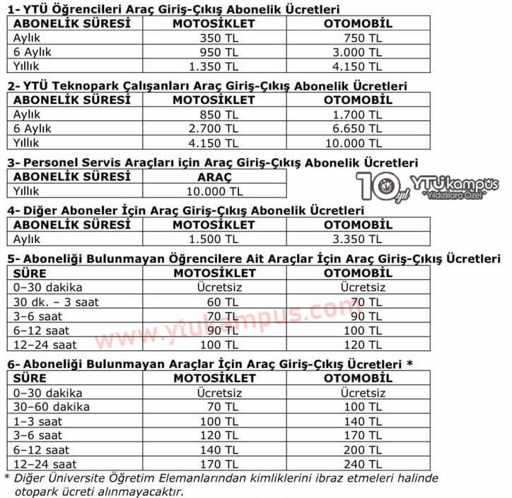 Yıldız Teknik Üniversitesi Davutpaşa Kampüsü ve Beşiktaş Kampüsünde 30 dk’yı aşan durumlar için araç ve motorsikletlerden otopark ücreti alınmaktadır. (İlk 30 dk ücretsiz.)
